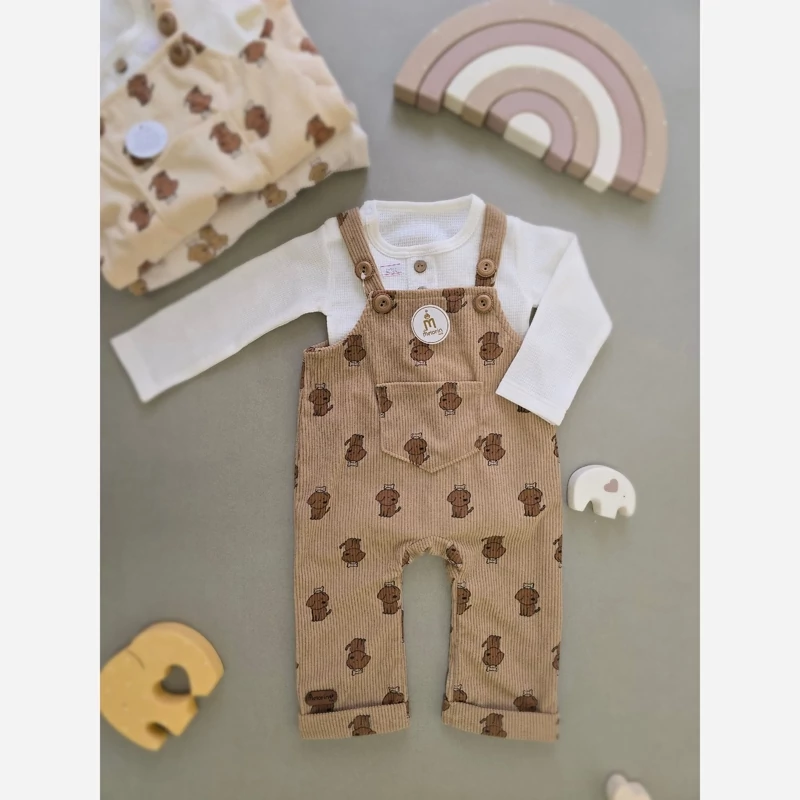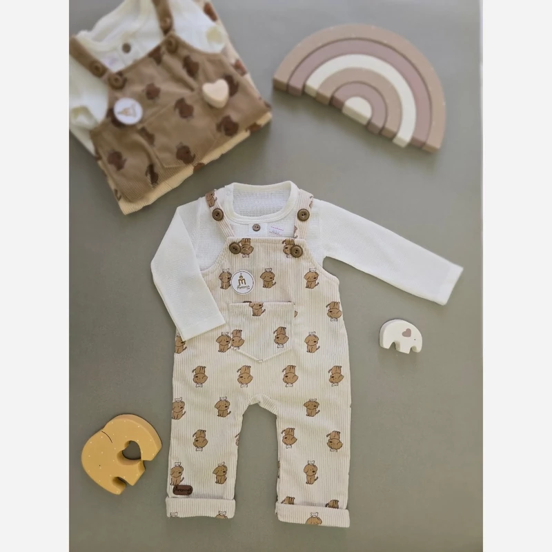 این ست دوست داشتنی شامل یک شلوار پیشبندی راحت و یک زیردکمه بادی آستین بلند با طرح زیبای سگ رنگی است که انتخابی عالی برای پوشاک روزمره نوزاد شماست.