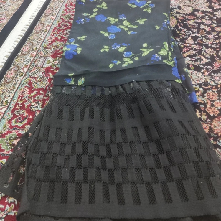 شال نخی گلدار آبی با حاشیه دانتل مشکی طرح هندسی اعلا